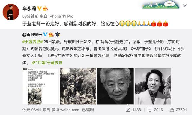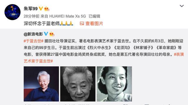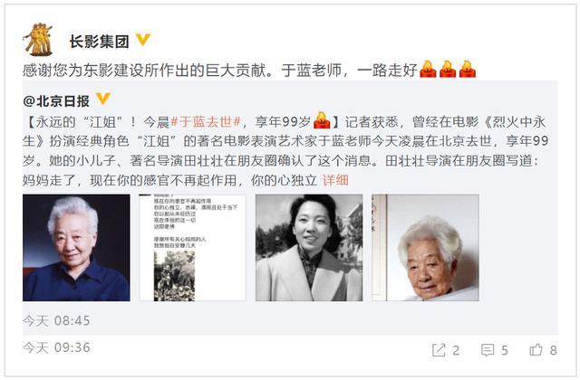 随后,长影集团官微转发于蓝老师去世的消息并发文沉痛悼念:“感谢您为东影建设所作出的巨大贡献。于蓝老师,一路走好。”除了中影和长影,还有很多明星纷纷发文悼念于蓝。