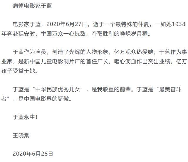 讣告中写道:我国著名电影表演艺术家、事业家,中国儿童电影事业的开拓者于蓝同志于6月27日晚21点07分在北京中日友好医院病逝,享年99岁。因疫情期间,将遵照家属意愿,丧事从简。