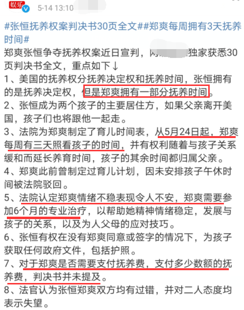 除了三天的抚养时间外,在判决书中还显示,法院认定郑爽的情绪非常不稳定,其表现令人不安,郑爽则需要接受六个月的专业治疗,以帮助她稳定情绪,发展与孩子的关系,以及为人父母的应对技巧。