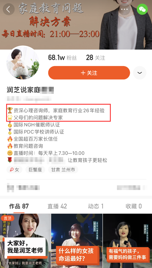 从关注的博主账号中显示,爽妈关注的是一位心理咨询师,从事家庭教育已经有26年的经验,且获得了国际上的讲师认证和催眠师认证,资历非常高,她每天也会按时直播为父母们解决问题。而她的账号中也录制了多条与父母教育有关的视频,其中就有“父母离异了孩子应该跟谁?”“你给孩子的爱分量够吗?”等视频。