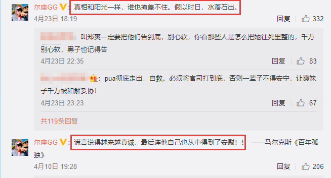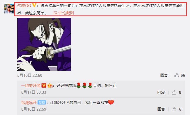 除了爽妈关注了心理咨询师外,郑爽的大伯在5月16日也曾在自己的账号中引用名言发声,直言“在喜欢你的人那里热爱生活,在不喜欢你的人那里看清世界,就这么简单”。而在此前判决还没有公开前,郑爽的大伯也多次发声维护郑爽,想来此刻也只有家人能够给予郑爽力量,让她好好接受治疗,与孩子建立良好关系。