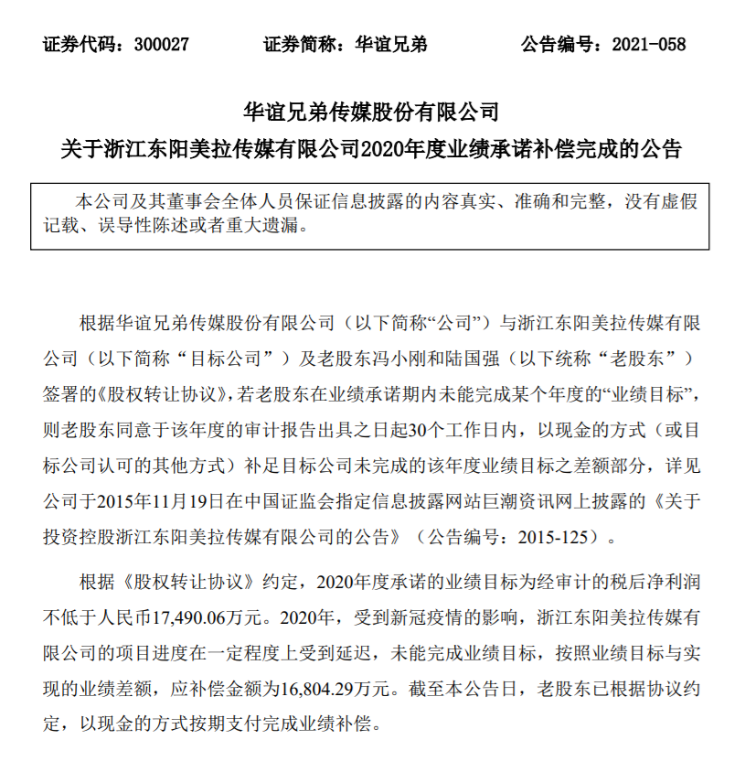 5月25日消息,华谊兄弟昨日发布关于浙江东阳美拉传媒有限公司2020年度业绩承诺补偿完成的公告。公告称,根据华谊兄弟传媒股份有限公司与浙江东阳美拉传媒有限公司及老股东冯小刚和陆国强签署的《股权转让协议》,若老股东在业绩承诺期内未能完成某个年度的“业绩目标”,则老股东同意于该年度的审计报告出具之日起30个工作日内,以现金的方式(或目标公司认可的其他方式)补足目标公司未完成的该年度业绩目标之差额部分。