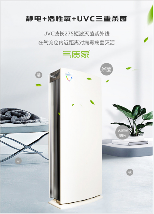 气质家静电式空气净化消毒机,克服了传统空气净化器杀菌效率低下的特点,采用6000伏特高压直流静电技术,高效率去除颗粒物的同时,还能瞬间杀灭悬浮在气溶胶中的病毒细菌。