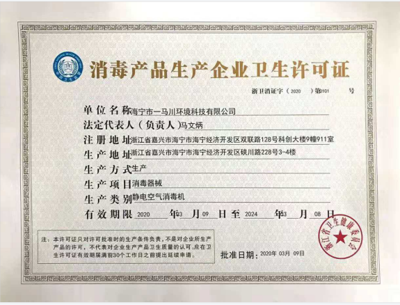 浙江一马川环境科技有限公司的产品拥有浙江省卫健委批准颁发的“消毒产品生产企业卫生设备许可证”,在抗“疫”期间,该公司曾先后向慈善机构捐赠价值约20万元空气净化消毒机,得到了社会各界的广泛好评。