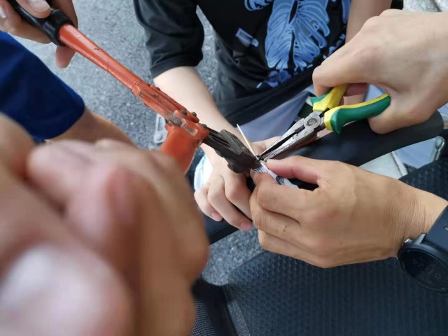 因男孩的手指已经肿胀,消防员只得拿来钳子等工具对戒指进行剪切。为防止对男子造成二次伤害,消防员将一块硬纸壳垫片和牙签插进了戒指和男子手指之间,然后利用钳子、指甲刀等工具进行剪切。几分钟后,戒指被剪断,男子的手指重获“自由”。(石艳升)