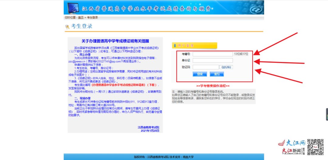 大江网/大江新闻客户端讯 (郑周贇)报道:7月22日,记者从江西省教育考试院获悉,江西省2021年上半年普通高中学业水平考试评卷、统分工作已结束,考试成绩已公布,考生可登录“江西省教育考试院”网站(网址:www.jxeea.cn)学考成绩查询窗口输入考籍号和身份证号进行成绩查询。