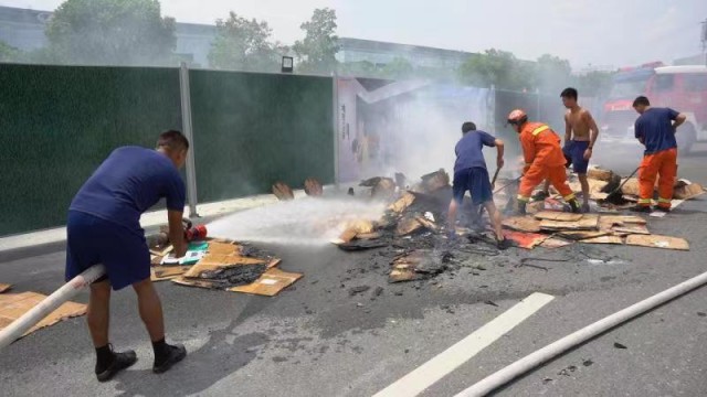 8月23日上午,上饶经济技术开发区消防救援大队岗哨执勤人员发现对面马路一辆三轮车上的纸壳发生自燃,(火灾处于初期阶段,明火较小),立即通知消防救援人员进行扑救。