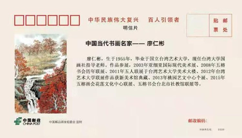 中国邮政出版的【中华民族伟大复兴——百人引领者•中国当代书画名家】为廖仁彬教授出版了精选作品邮票专辑,可喜可贺!