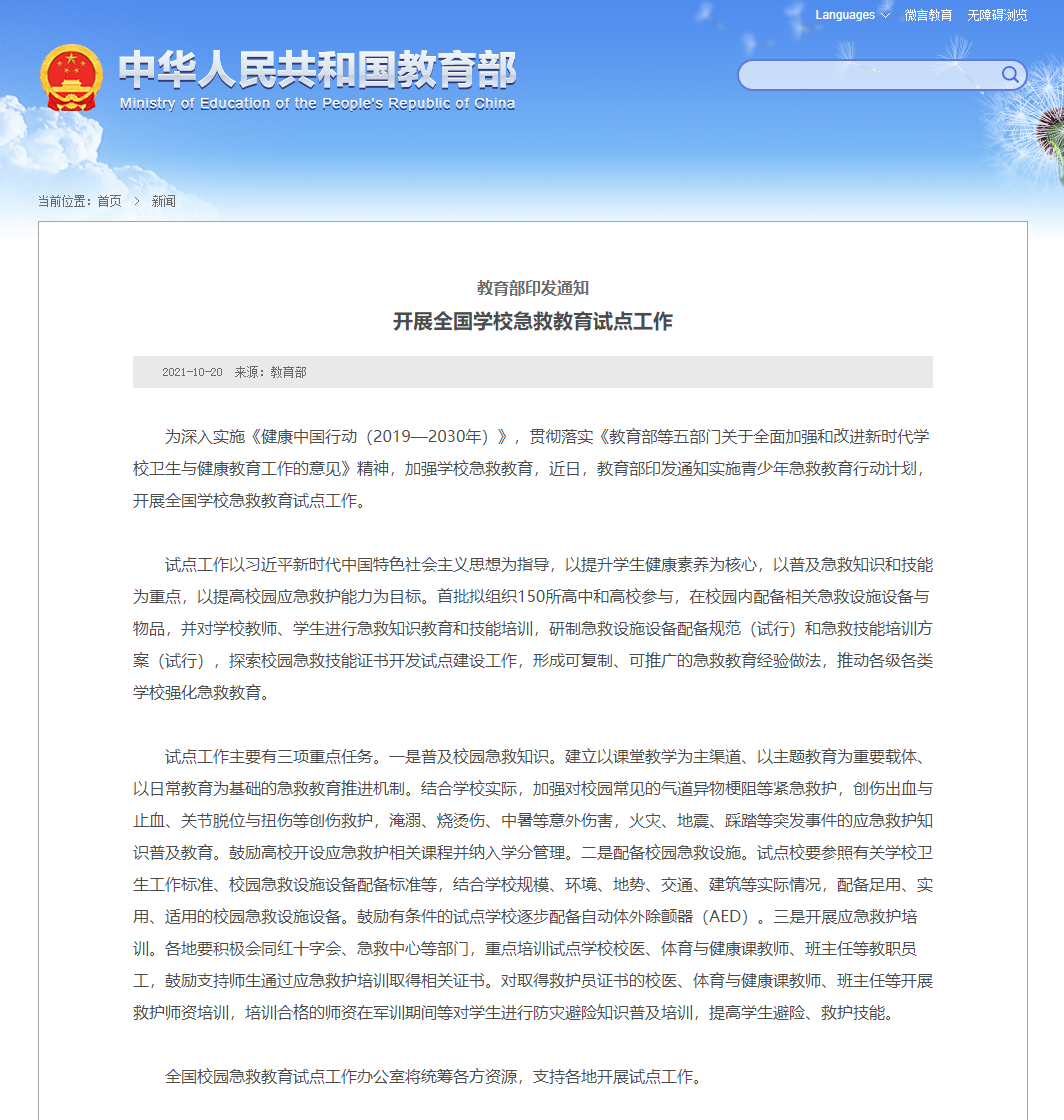 教育部近日印发通知实施青少年急救教育行动计划,开展全国学校急救教育试点工作,首批拟组织150所高中和高校参与。重点任务包括普及校园急救知识、配备校园急救设施和开展应急救护培训。将加强对校园常见的气道异物梗阻等紧急救护,创伤出血与止血、关节脱位与扭伤等创伤救护,淹溺、烧烫伤、中暑等意外伤害,火灾、地震、踩踏等突发事件的应急救护知识普及教育。(记者王鹏)