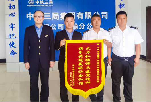 11月6日,黄黄铁路浠水火车站为中铁三局线桥公司运输分公司党支部赠予:“大力弘扬伟大建党精神,携手共筑美好社会和谐”的锦旗,充分肯定党支部带领黄黄项目全员为浠水县铁路建设做出的巨大贡献。