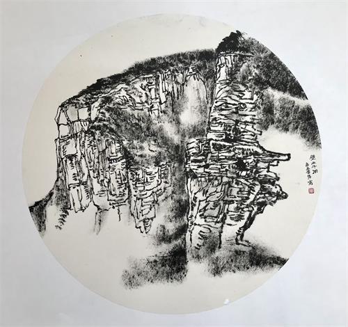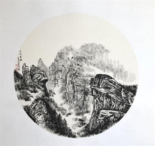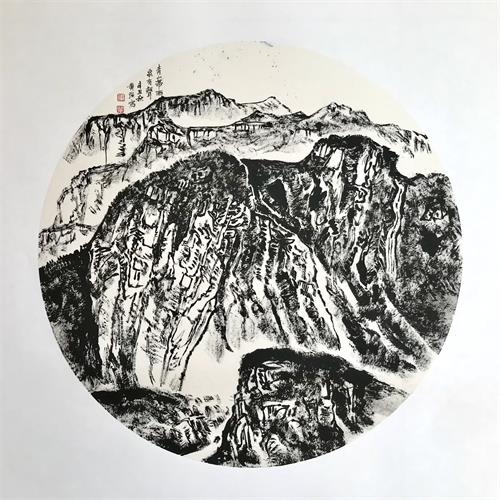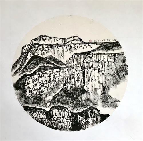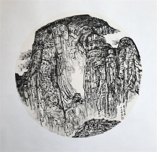 在黄强的太行山写生作品中,我们看到了郁郁葱葱的林海,千姿百状的山石,斧劈刀削的岩壁,错落纵横的沟谷和美丽的溪瀑。有高低起伏,有秀美雄壮。那不仅仅是山,更是自然赋予的坚韧,墨中见笔,能感受到其用笔时的提按、快慢、轻重和虚实,运笔有力,顿挫自然;他努力发挥自己的能动性,用真情实感去“度物象而取其真”,完成笔墨的转换,用笔墨去完成画面,完成了情意的抒写,一笔一墨无不写的是情感与内心。到太行山去写生,画的是自己的期待,画自己的寄托,画自己的心愿。画那些自己都不知道能不能画出来的精神世界,并且把这精神融入到树木、山峦、天空之中。