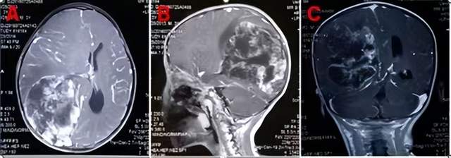 来自平顶山的宋佳(化名)是一位仅仅3岁的患儿,因头痛、左侧肢体活动无力2022年1月慕名来到郑州大学第一附属医院神经外科找到郭付有教授就诊。宋佳入院后,经磁共振(MRI)检查显示:右侧颞顶枕部位有一巨大占位,脑肿瘤几乎占据了他脑容积的半壁江山,高达二分之一。在有限的颅腔空间内,巨大的肿瘤挤占了大量空间,压迫到正常脑组织,导致颅内压增高,出现一系列如呕吐,头痛,走路不稳,肢体瘫痪等症状。小男孩术前症状极其严重,病情发展迅速且危急,治疗过程几乎是与死神争抢时间。