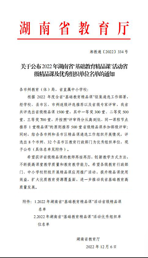 基础教育精品课遴选是为深入贯彻落实党中央、国务院决策部署,适应新时代基础教育高质量发展的需要,由教育部实施开展的全国性教师业务能力评比活动。本次遴选由校、区(县)、市、省、国家等各级教育部门严格审核,层层选拔所产生。本次成绩的取得再次体现了长沙市实验小学梅溪湖学校教师团队勇于开拓、团结互助的精神风貌。