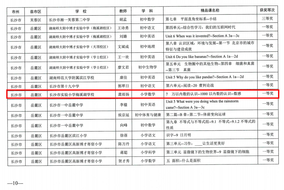 长沙市实验小学梅溪湖学校教师龚雨扬荣获省级“基础教育精品课”一等奖
