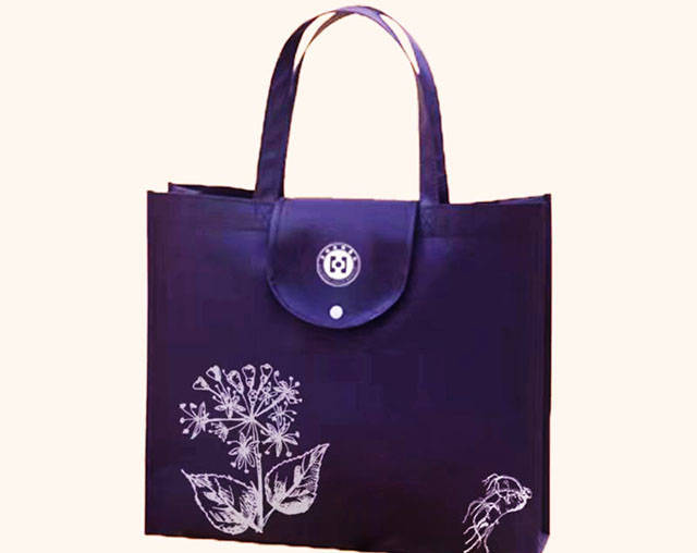 该文化袋是新一代环保材料,具有防潮、透气、防水、质轻、不助燃、容易分解等特点,并且可以重复使用。袋子设计漂亮、简洁大方,正面为书法题词《生命在呼吸之间》,背面为中草药简笔图案。