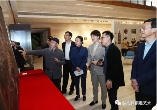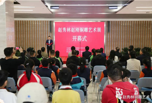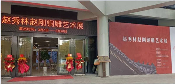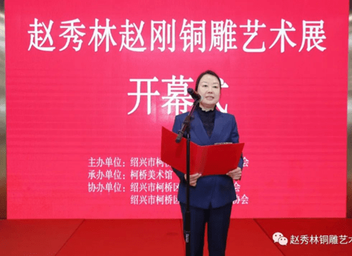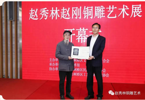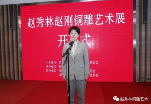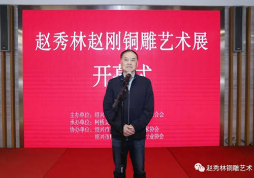 为积极响应我区“文化强区”建设要求,持续彰显“人文柯桥”魅力,努力打造“老绍兴 金柯桥”城市品牌,由绍兴市柯桥区文学艺术界联合会主办,柯桥美术馆承办,绍兴市柯桥区民间文艺家协会、绍兴市柯桥区工艺美术行业协会协办的赵秀林赵刚铜雕艺术展开幕式于2023年3月11日上午在柯桥美术馆举行。柯桥区人大副主任蔡金标、柯桥区人民政府副区长王艳春、柯桥区政协副主席王茂荣、绍兴市工艺美术行业协会会长毛顺生、绍兴职业技术学院建筑与艺术学院副院长俞俊毅、柯桥区文联党组书记、主席盛顺利、柯桥区文联副主席吴炎标、绍兴市工艺美术行业协会副秘书长王洋等领导出席。活动由盛顺利主席主持,区领导王茂荣、绍兴市工艺美术行业协会会长毛顺生致辞,赵秀林老师向来宾介绍了本次展览举办的初衷,弟子代表宋若愚进行了发言。开幕式上,赵秀林老师向柯桥美术馆捐赠了亲手打造的铜雕作品。