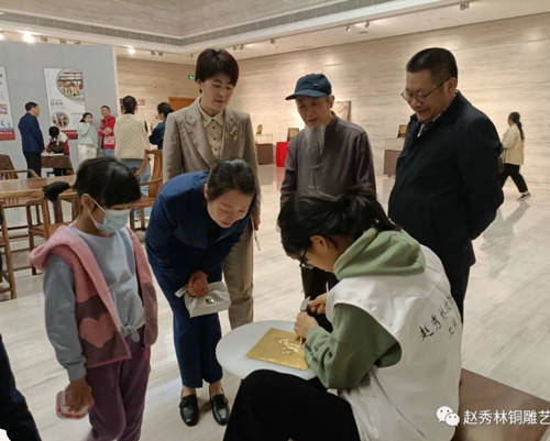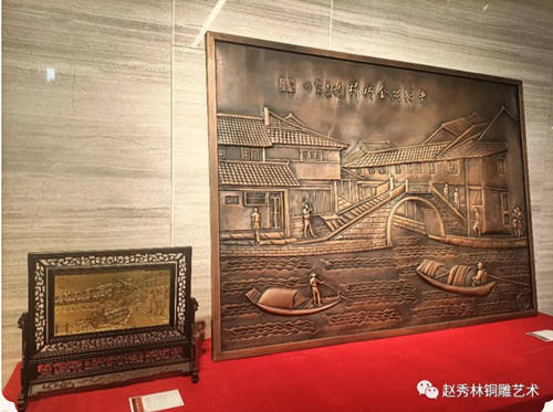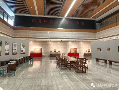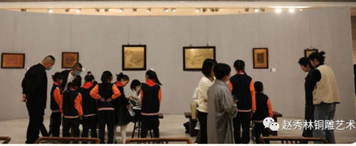 本次展览的主题为:千年铜雕技艺,百年五代传承。展览展出了赵秀林老师和赵刚老师近年来创作的80余件新作,其中半数以上作品为省级以上获奖作品。展品题材丰富,既有“老绍兴 金柯桥”为内容的乡情主题、建党红色主题,还包括山水、花鸟、书法、宗教等传统表现内容。作品制作工艺方面也是丰富多元,囊括了铜雕锻打錾刻、铸造、凿刻等全部传统铜雕制作技艺。展览现场,还展出了赵秀林老师七个铜雕传承基地的介绍,绍兴职业技术学院赵秀林省级技能大师工作室学员、柯灵小学铜雕社社员现场进行了技艺展示。