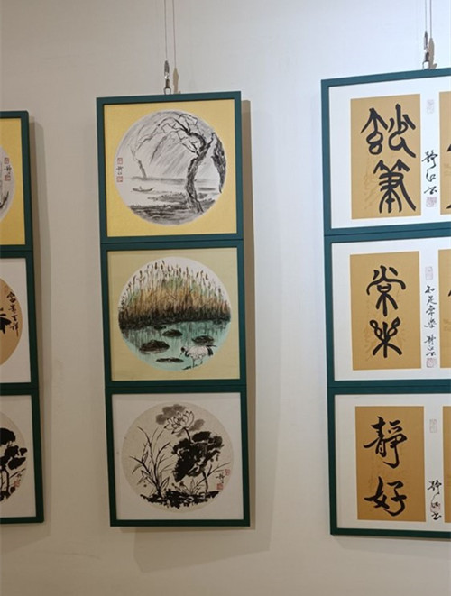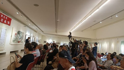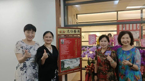 中国翰林书画院秘书长刘珺女士与何庆珍老师、邱秀莉老师、林清珠老师在展厅入口一同为杨静江院长80回顾书画展点赞!