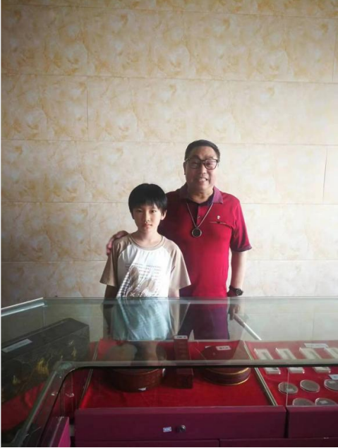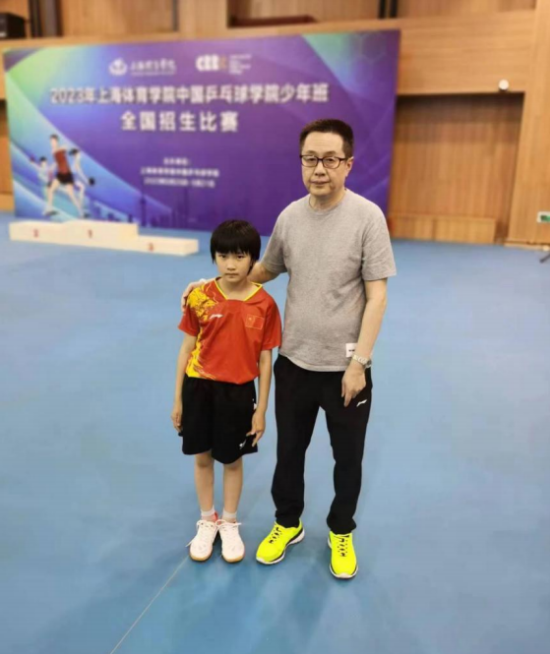 2023 年 5 月 21 日 13 点 50 分,中国乒乓球学院院长施之浩,饶有兴致地与这位“少年英雄、未来之星”在赛场合影!