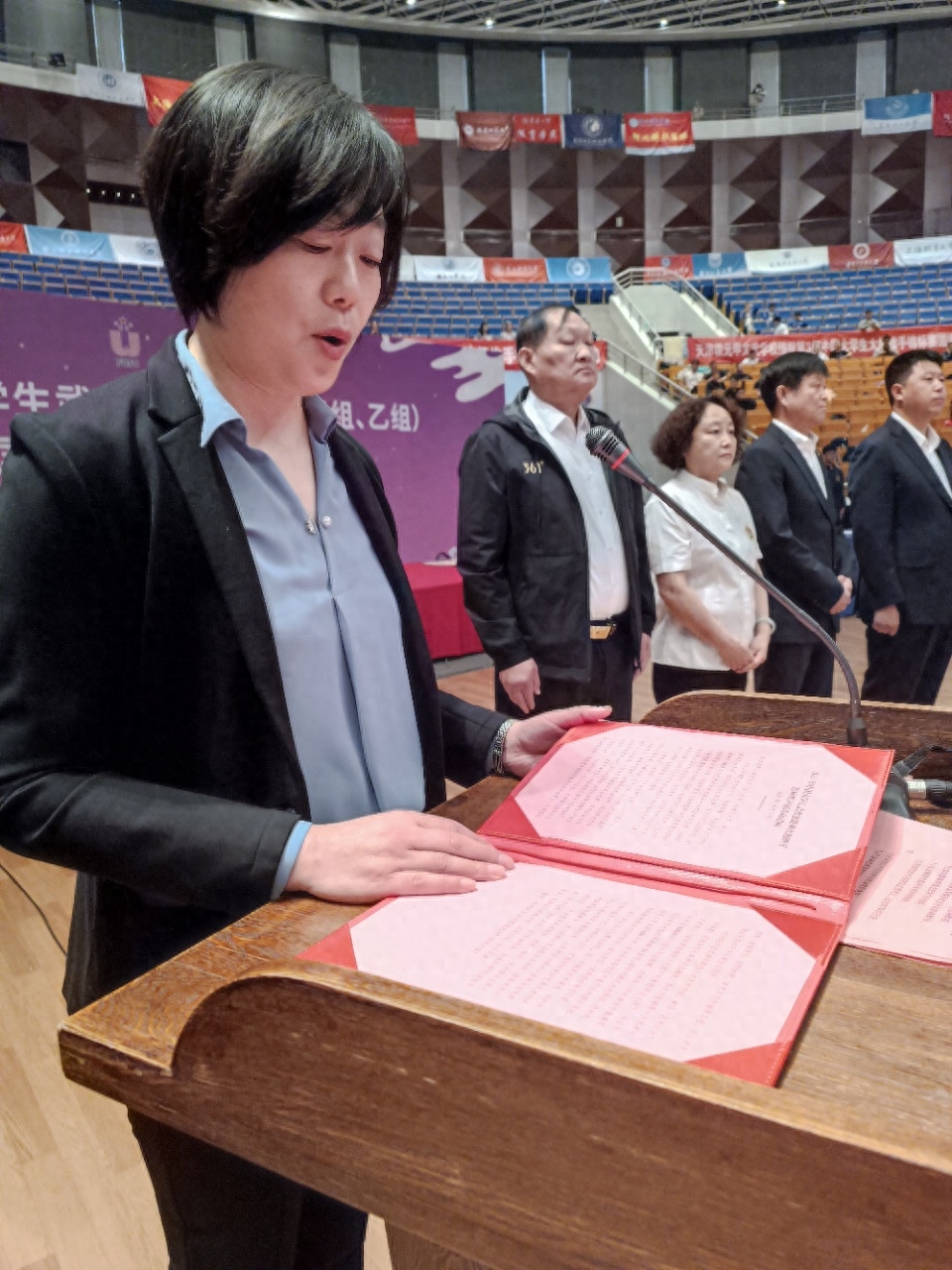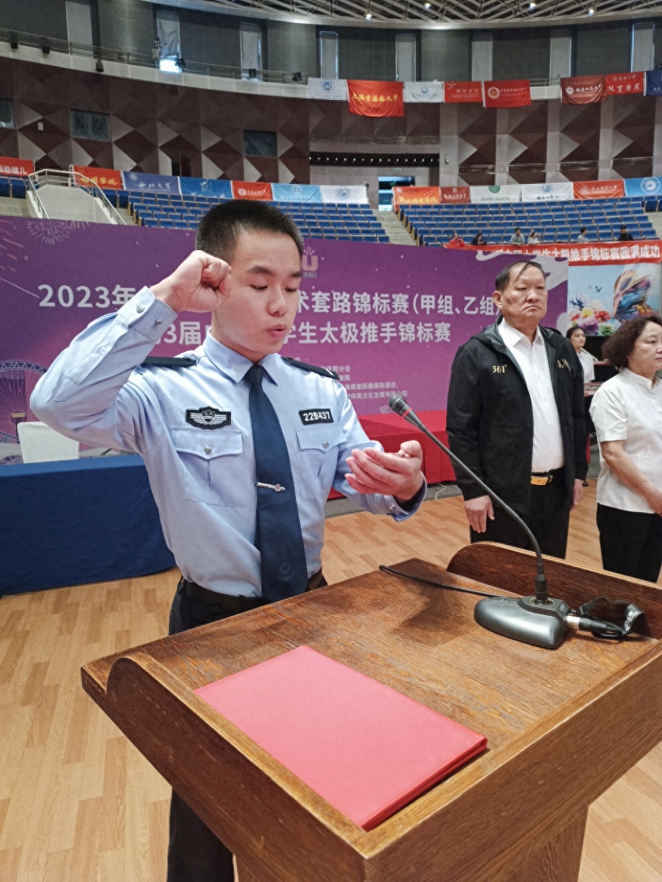 中国人民公安大学杨济源代表全体运动员宣誓方秀娟代表全体裁判员宣誓。