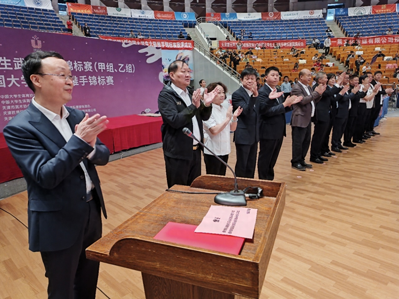 10月7日由中国大学生体育协会主办,中国大学生体育协会民族传统体育分会执行,天津市武术协会、天津市武清区体育局承办,天津津璐体育文化发展有限公司、天津奥蓝际德国际酒店等单位协办的2023年中国大学生武术套路锦标赛(甲、乙组)、第三届中国大学生太极推手锦标赛在天津市武清区隆重开幕。教育部学生体育协会联合秘书处工会主席王晓毅,中国大学生体育协会民族传统体育分会主席杜长有,天津市教委二级巡视员、体美劳教育处处长张健青,天津市武清区人民政府区长许颖悟,天津市武清区副区长姜述英,天津市武清区政府办公室主任王国成,天津市武清区体育局局长张迎新,国际武术联合会裁判委员会主席、中国大学生体育协会民传分会秘书长苏长来教授,本次赛事竞赛监督委员会主任花妙林教授,本次赛事仲裁主任李巧玲教授,本次赛事总裁判长徐彩桐教授,天津市武术协会党支部书记、副主席李纯云,天津市武术协会副主席胡世然、张建英等领导出席了开幕式。
