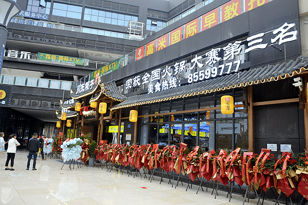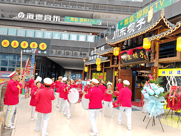 12日上午,进入丰都县城吸引眼球的是久桓时代广场上大量祝贺条幅挂满墙,引起了当地居民的关注,大街上腰鼓队锣鼓喧天,川东坝子老火锅门前摆满了花篮。前来吃火锅的客人及前来祝贺的亲朋好友们汇集一堂,场面热闹非凡。