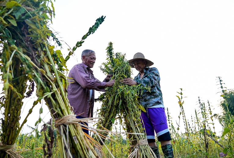 近日,横峰县莲荷乡杨家村黑芝麻基地里,农民忙着收割芝麻。近年来,横峰县大力发展特色农产品黑芝麻种植,小芝麻变成大产业,帮助农民实现了增收致富。侯先钢 摄