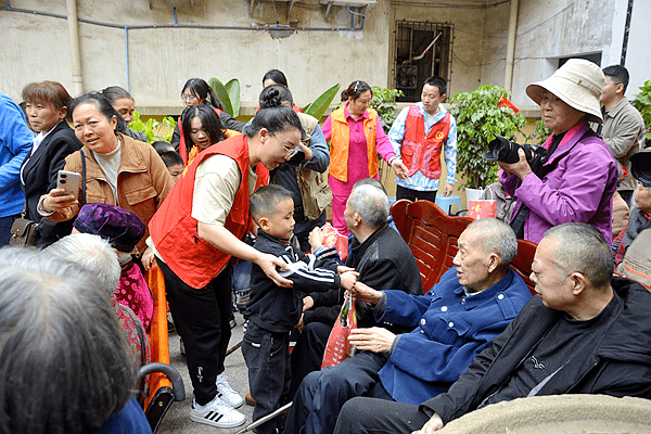 孩子们还为老人们送上了节日礼物,收到孩子们的礼物,老人们既开心又感动。一名老人说:“今天特别高兴,一老一小待在一起仿佛回到了童年。”