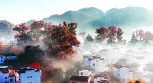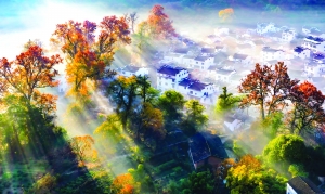 随着太阳渐渐升起,雾慢慢上升,炊烟袅袅,它们悬浮在石城上空,一座座徽派建筑,若隐若现,仿若仙境。高大的枫香,一半在雾里,一半在空中。在阳光的照射下,乳白色的雾与闪耀的枫红相互映衬,构成一幅绝美的画面。这样的画面会令人陶醉,会令人忘我。