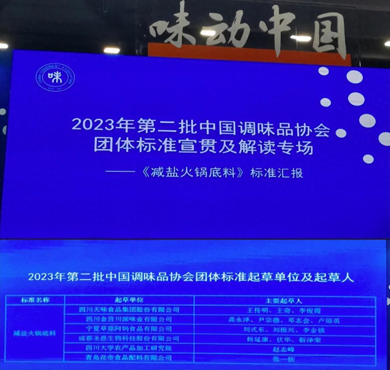2023年金宫川派味业参与的团体标准中,《牛油火锅底料》《老坛酸菜鱼调料》标准,早在今年3月4日公布的2023年第一批中国调味品协会团体标准中亮相。加上本次公布的《减盐火锅底料》,一年内已有3项金宫川派参与起草的团体标准发布实施。