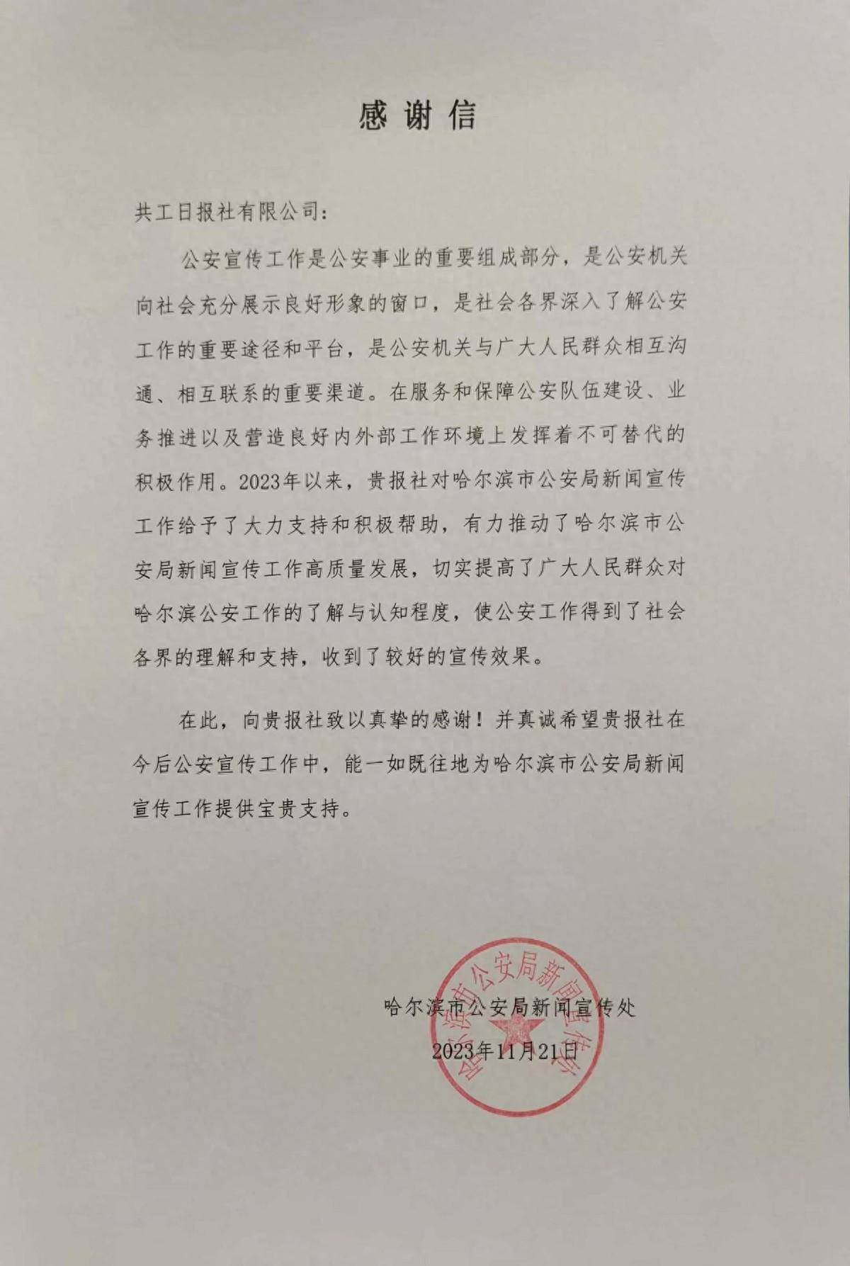 2023年11月21日,黑龙江省哈尔滨市公安局致信共工日报社,书面感谢共工日报社近一年来助力推动公安新闻宣传工作高质量发展。