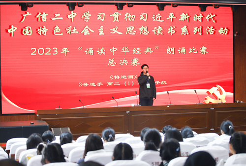 为深入学习贯彻习近平新时代中国特色社会主义思想,丰富学生校园文化生活,培养学生的人文素养,落实立德树人根本任务,促进素质教育的全面实施,近日,广信二中举行了“诵读中华经典”学生朗诵比赛。