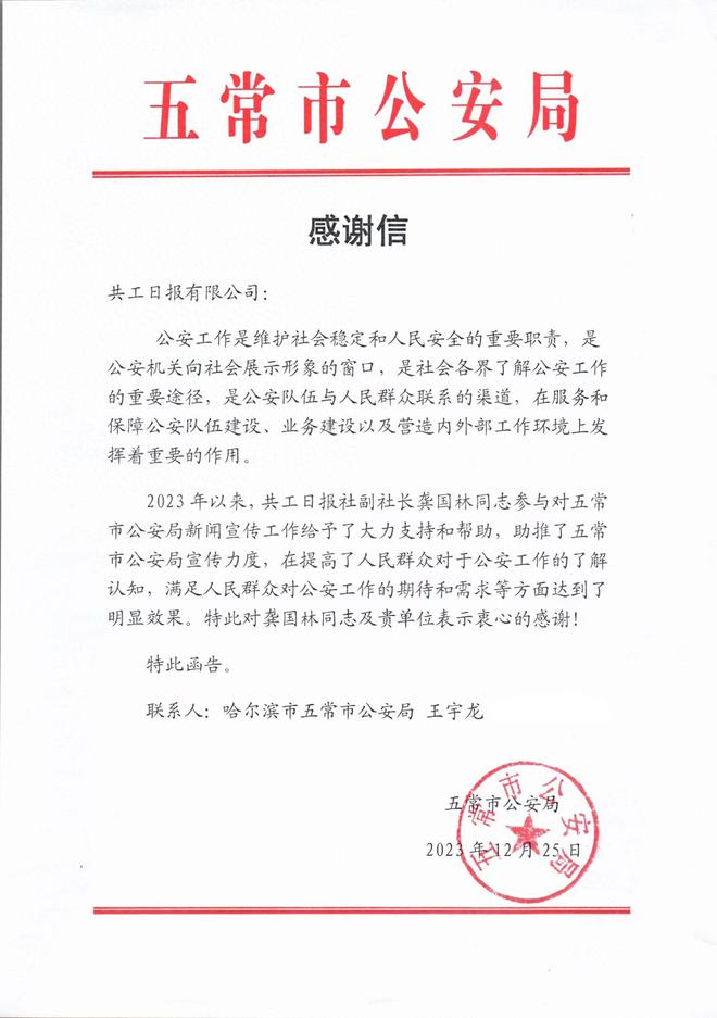 2023年以来,共工日报社副社长龚国林同志参与对五常市公安局新闻宣传工作给予了大力支持和帮助,助推了五常市公安局宣传力度,在提高了人民群众对于公安工作的了解认知,满足人民群众对公安工作的期待和需求等方面达到了明显效果。特此对龚国林同志及贵单位表示衷心的感谢!(完)