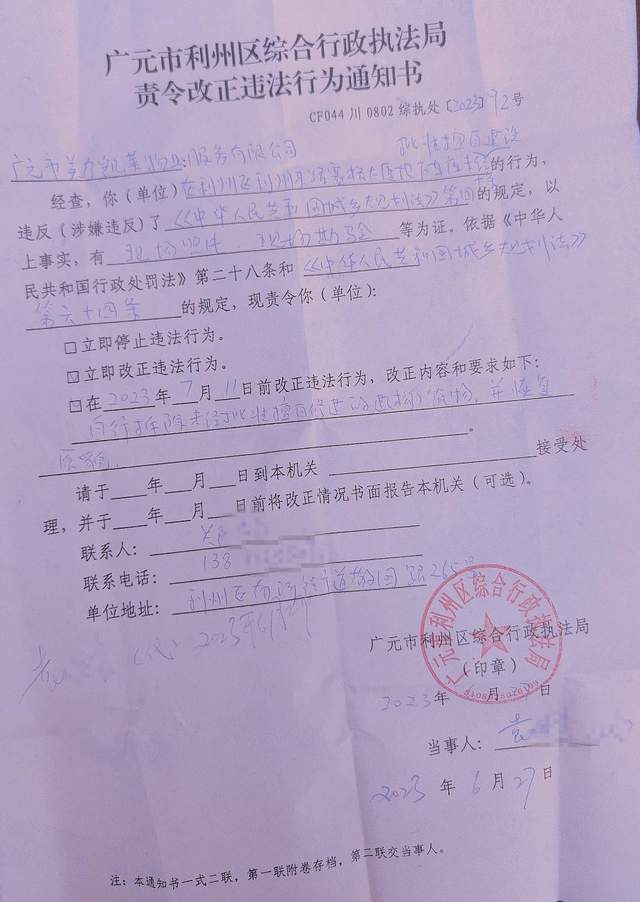 本网再次到广元市赛格大厦附近的一些居民和市民了解情况,据当地附近居民反映,该物业公司于2022年下半年在无任何审批手续的情况,擅自改变建筑结构,利用疫情期间晚上作业,对其地下室附一楼进行违规违建,将原本只有一层的车库变成了两层,并在其他地方多处做了改变,不仅违反城乡规划且严重影响建筑安全。在当地居民和市民举报后,广元市利州区综合行政执法局,前往广元市美力凯莱物业服务有限公司赛格大厦地下车库未经批准擅自建设的行为进行了现场勘验和取证,并于2023年6月27日下达了责令改正违法行为通知书。可是半年过去了,这一执法行为遭到该物业公司顽强抵抗,公司通过各种途径找各种关系企图给执法部门施加压力,视行政责令改正违法行为通知书废纸一张。因此,目前,尚未下达正式的处罚决定书。
