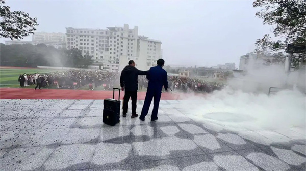 学生撤离教室后,由各指导撤离老师引导学生在操场集中。该校负责人对学生讲解了相应的消防知识以及演练过程中还需要注意的细节。消防大队宣教员向师生介绍了不同类型的灭火器及其使用方法,强调了在火灾初起阶段及时扑灭火源的重要性,并当场示范如何正确使用灭火器。