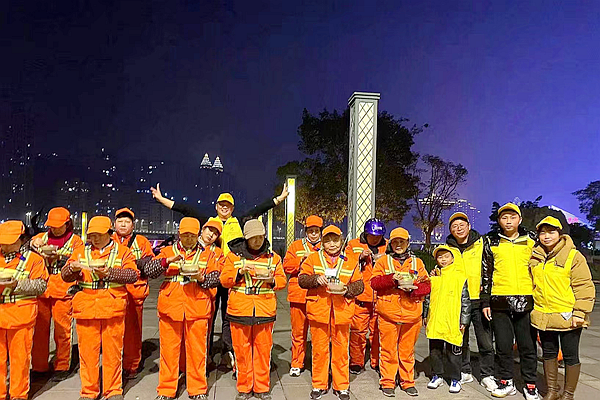 新年钟声即将敲响,在重庆市涪陵城区白鹤梁大道绿地海域、江东滨江路万达广场、宏声大道森林公园门前便出现一群温暖的身影,他们将一碗碗油醪糟糍粑、荷包蛋送到坚守在工作一线的环卫工人手上。