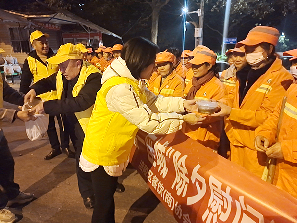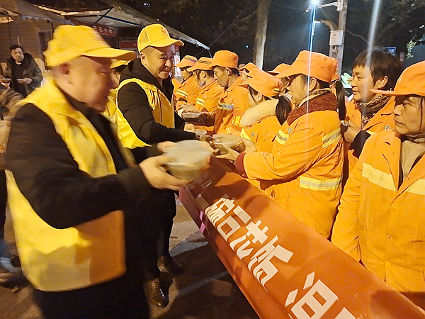 随后,大家便带着210份热腾腾的油醪糟糍粑加荷包蛋,分成三路,分别送给正在清扫路面的环卫工人们,“你们辛苦了!”、“新春快乐!”一句暖心的话语,表达着一份敬意。