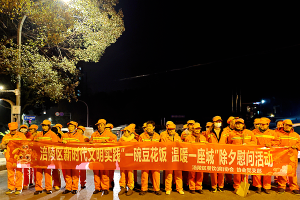 这些在除夕夜为环卫工人送温暖的是来自涪陵区城市管理局、区餐饮(商)协会、区蓝天救援队志愿者们,这样的志愿者活动他们每年都在进行,他们希望能让城市的“美容师”感受到社会大家庭的温暖。