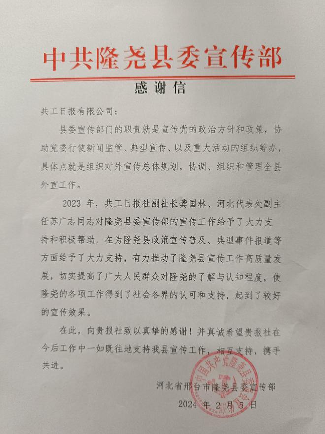 日前,记者从共工日报社获悉:为感谢助推隆尧县地方宣传工作高质量发展,2月5日,中共隆尧县委宣传部书面致信感谢共工日报社。