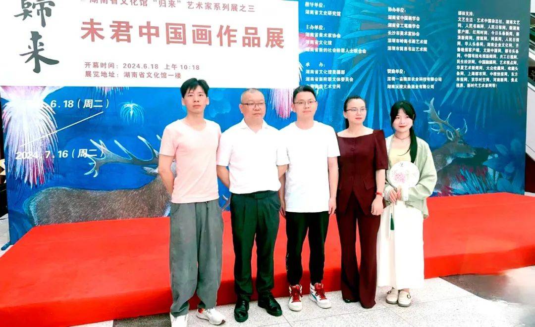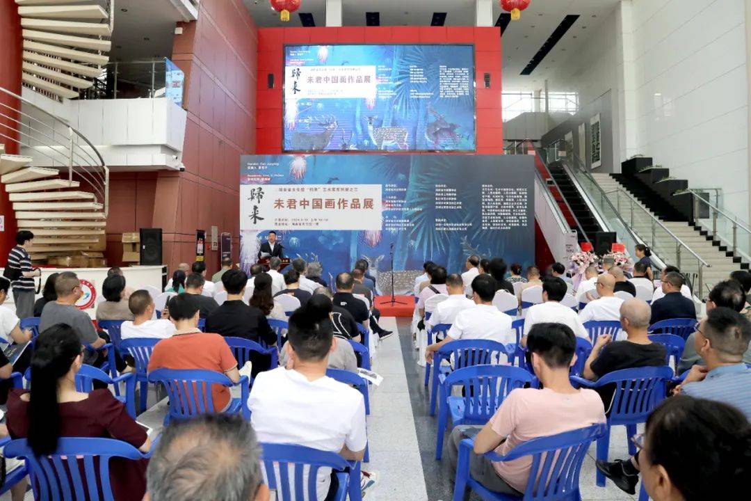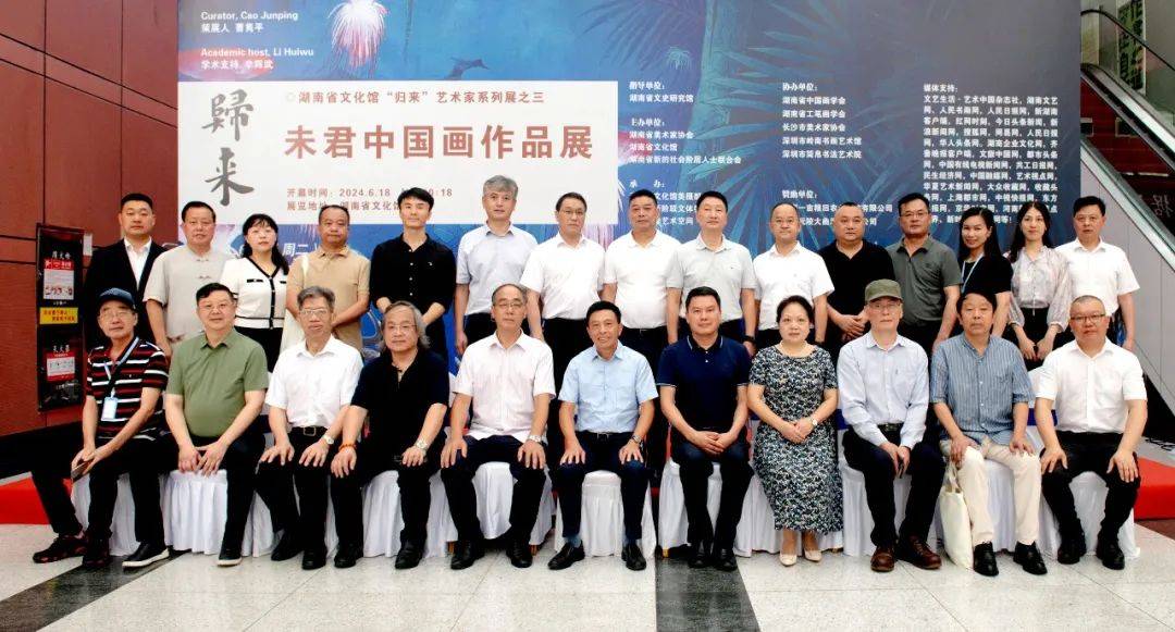 6月18日上午,由湖南省文史研究馆指导,湖南省文化馆、湖南省美术家协会、湖南省新的社会阶层人士联合会共同主办的“归来——未君中国画作品展”在湖南省文化馆隆重开幕。本次展览为湖南省文化馆归来系列展之三,共展出从北京回到家乡的艺术家未君近十年来创作的一批经典力作80余件,展现未君在传承古典山水、花鸟画,并在守正创新、推进艺术现代化和探索超现实主义绘画上的突出成就。画展由湖南省文化馆副馆长、著名书法家、教育家、收藏家曹隽平担任策展人,由湖南省美协理论委员会主任,湖南省画院创研部副部长李辉武担任学术主持。展览由中共湖南省委统战部原副部长龙建湘宣布“归来——未君中国画作品展”开幕。