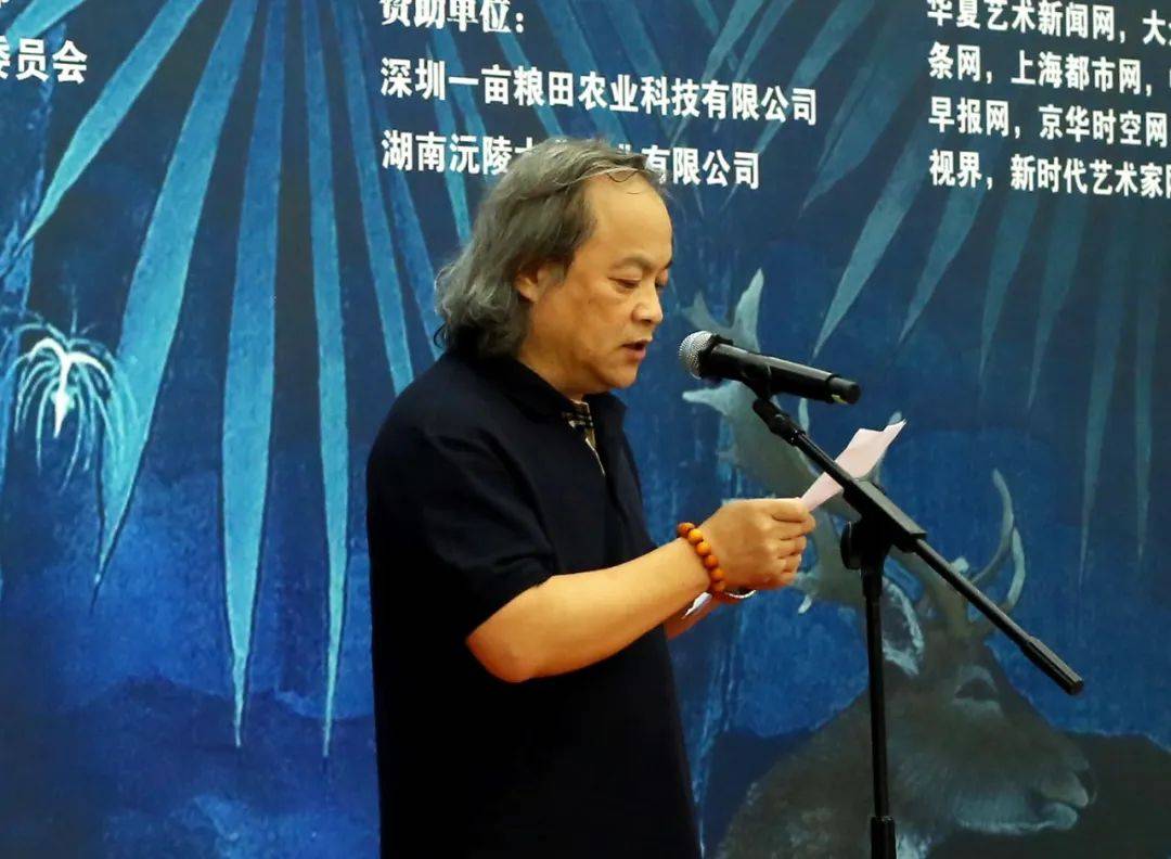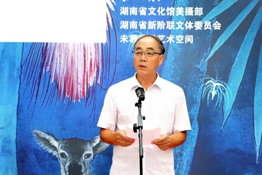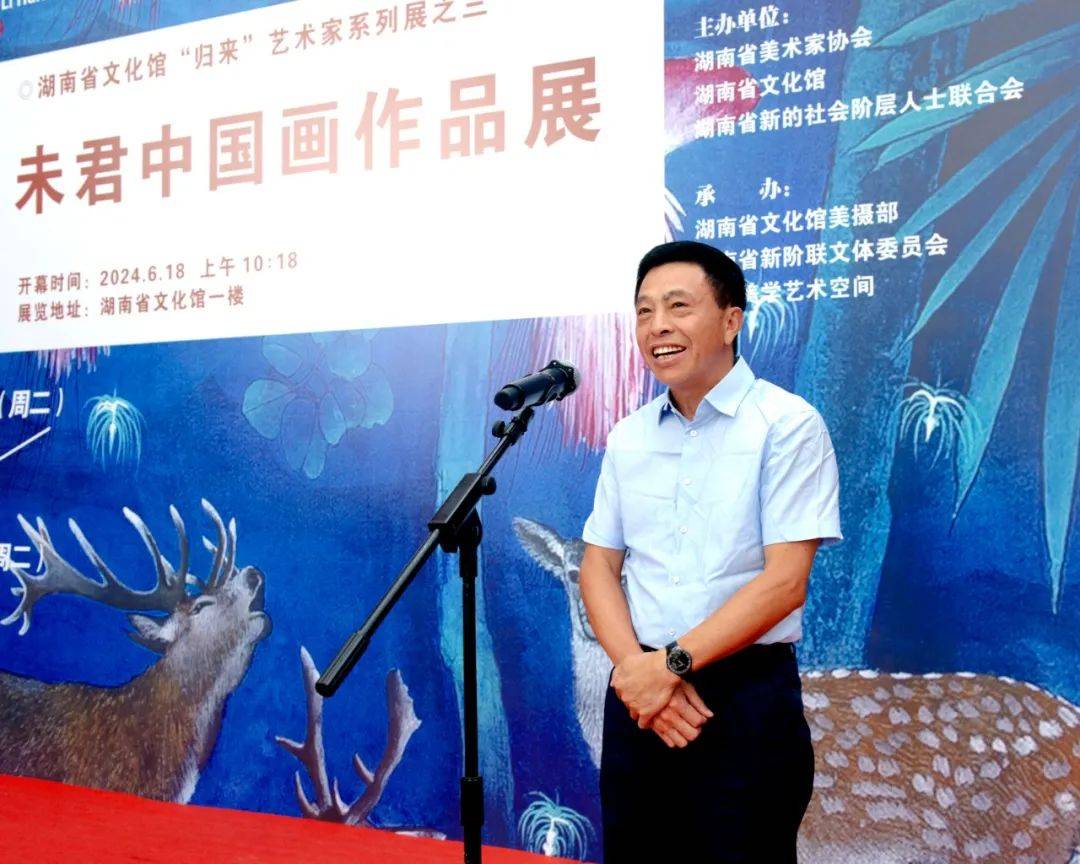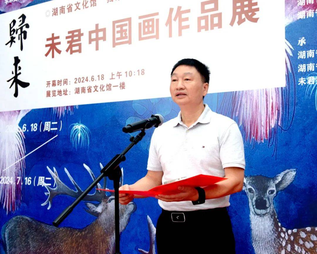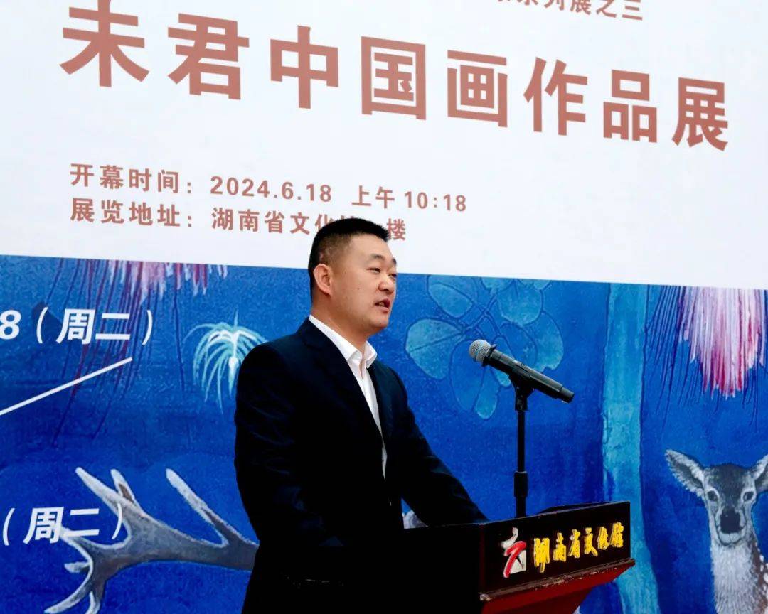 叶伟平在致辞中代表湖南省文化馆,向莅临本次画展的各位领导、艺术家、艺术爱好者以及各界朋友们,表示最热烈的欢迎和最衷心的感谢!他说未君先生作为当今画坛的杰出代表,其作品以独特的艺术风格和深刻的内涵,展现了对自然、生活和人性的深刻洞察与感悟。他的画作,无论是细腻的工笔,还是豪放的写意,都蕴含着无尽的诗意与哲思,让观者在欣赏艺术之美的同时,也能感受到心灵的触动和启迪。此次画展,是未君先生多年来艺术创作的一次集中展示,也是他艺术生涯中的一个重要里程碑。在这里,我们将有幸领略到他笔下的山川秀丽、花鸟灵动、人物传神,仿佛置身于一个充满奇幻与美好的艺术世界。