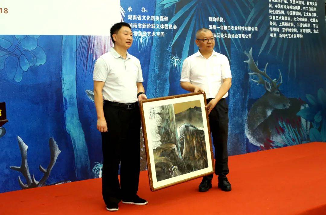 还有湖南省美协、湖南省文化馆、湖南省新阶联,九三学社湖南省委机关、九三学社湖南省书画院、湖南省工笔画学会、湖南省中国画学会、长沙市美协,深圳市岭南书画艺术馆、深圳市简帛书法艺术院,还有湖南省新阶联文体委员会、赞助单位深圳一亩粮田农业科技有限公司、湖南沅陵大曲酒业有限公司的相关领导等嘉宾参加开幕式。