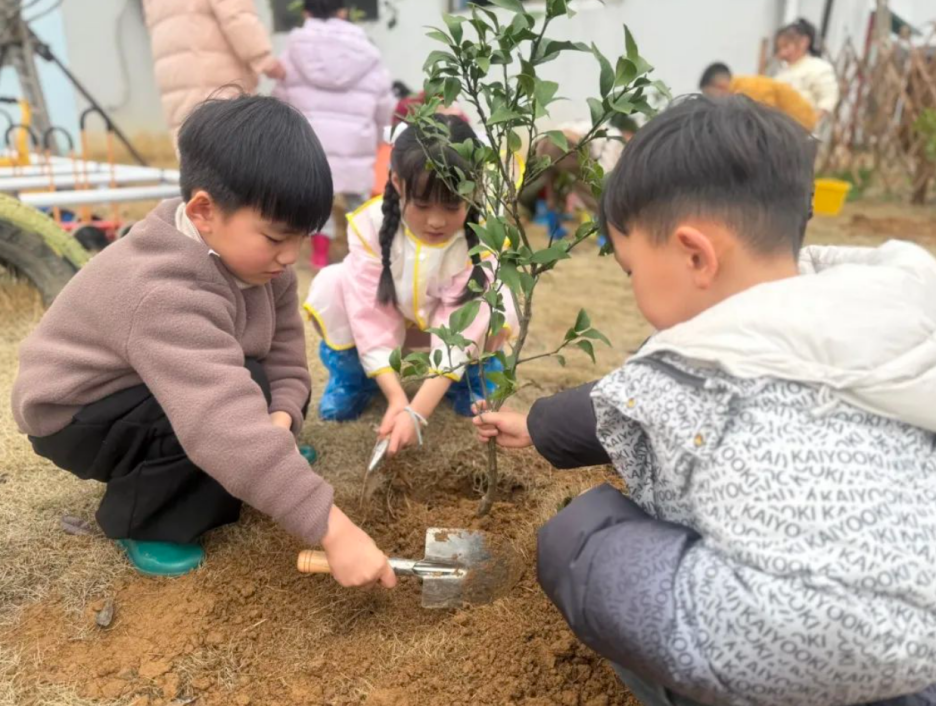随后,孩子们迎来亲手实践的环节。他们手持小铲子、小水壶,分组协作,庄重地将桔子树苗埋入泥土,浇水、填土,完成“树宝宝诞生仪式”。在这个过程中,孩子们不仅体验到劳动的乐趣,更直观地感受到生命的孕育与成长。