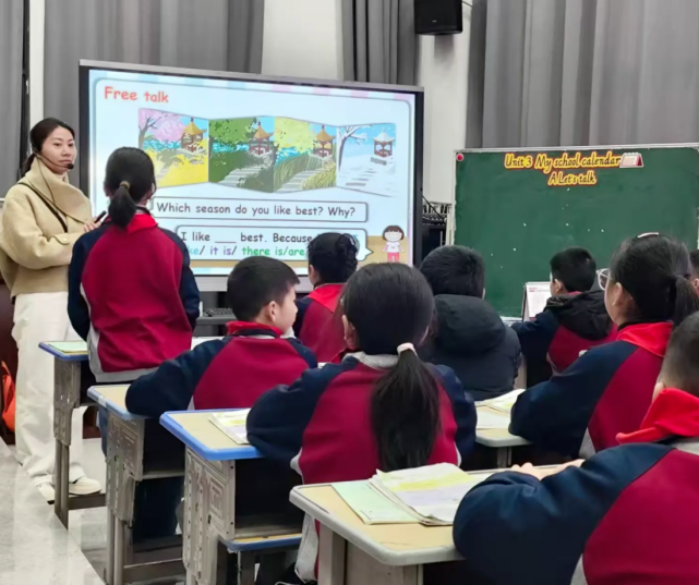 展示课环节,三年级授课教师聚焦“Unit 2 Expressing Yourself”展开教学。教师紧扣“情绪表达”这一主题,巧妙构建起与学生日常生活紧密相连的情境,引导学生熟练运用目标语言进行情感抒发。同时借助生动丰富的肢体语言,组织趣味十足的表情互动游戏,助力学生轻松掌握情绪相关词汇,显著增强了课堂的趣味性与互动性,充分点燃了学生的学习热情。五年级授课教师则针对“Unit 3 My School Calendar”进行授课,以“校园生活”为主脉络,精心策划一系列任务型教学活动,引导学生运用所学语言知识描述校园活动与日程安排。课堂采用小组合作学习模式,鼓励学生积极投入讨论,锻炼了学生的合作与沟通能力。课堂上也巧用多媒体技术,展示大量鲜活的图片与视频素材,让学生直观理解语言知识,课堂教学精彩纷呈。