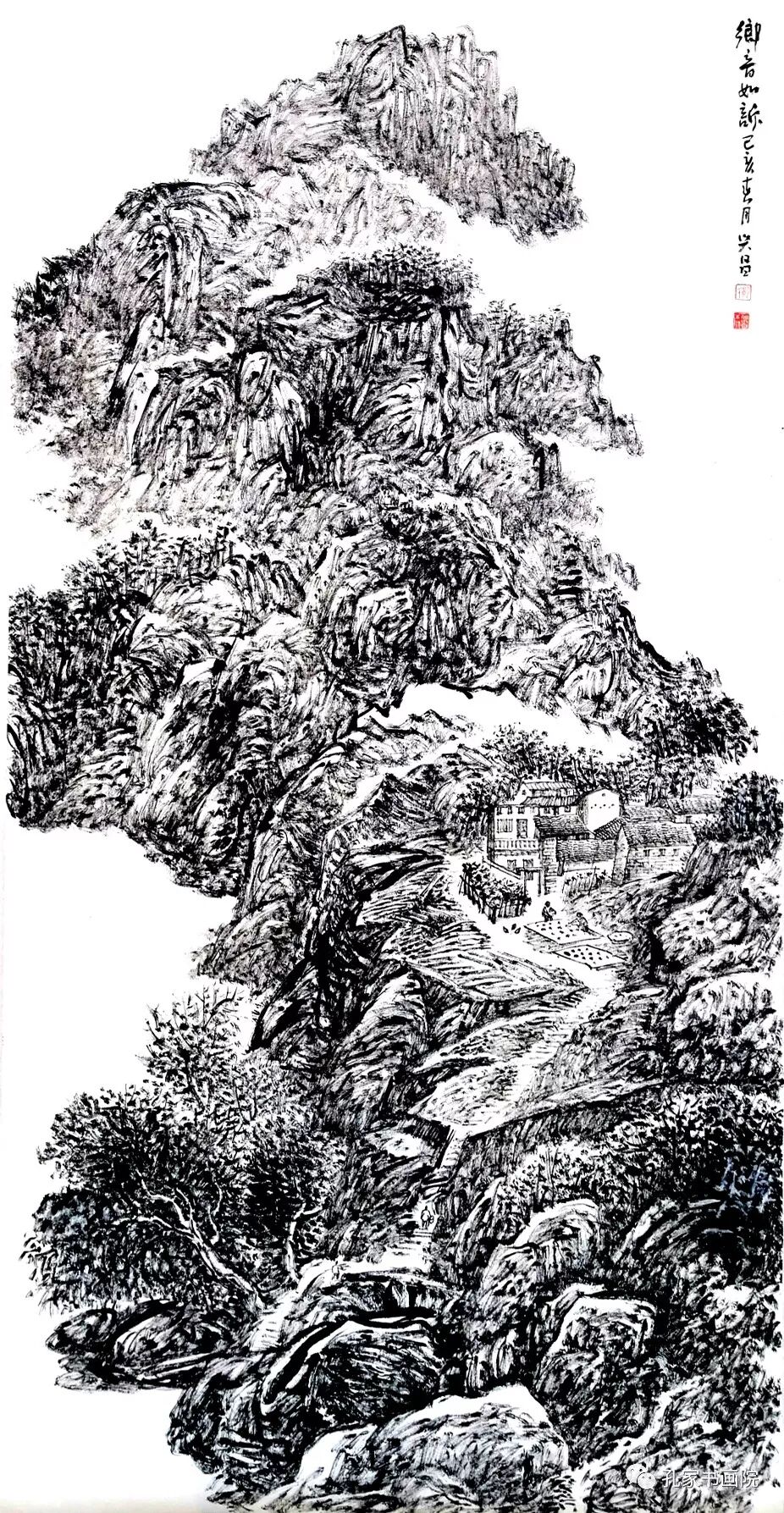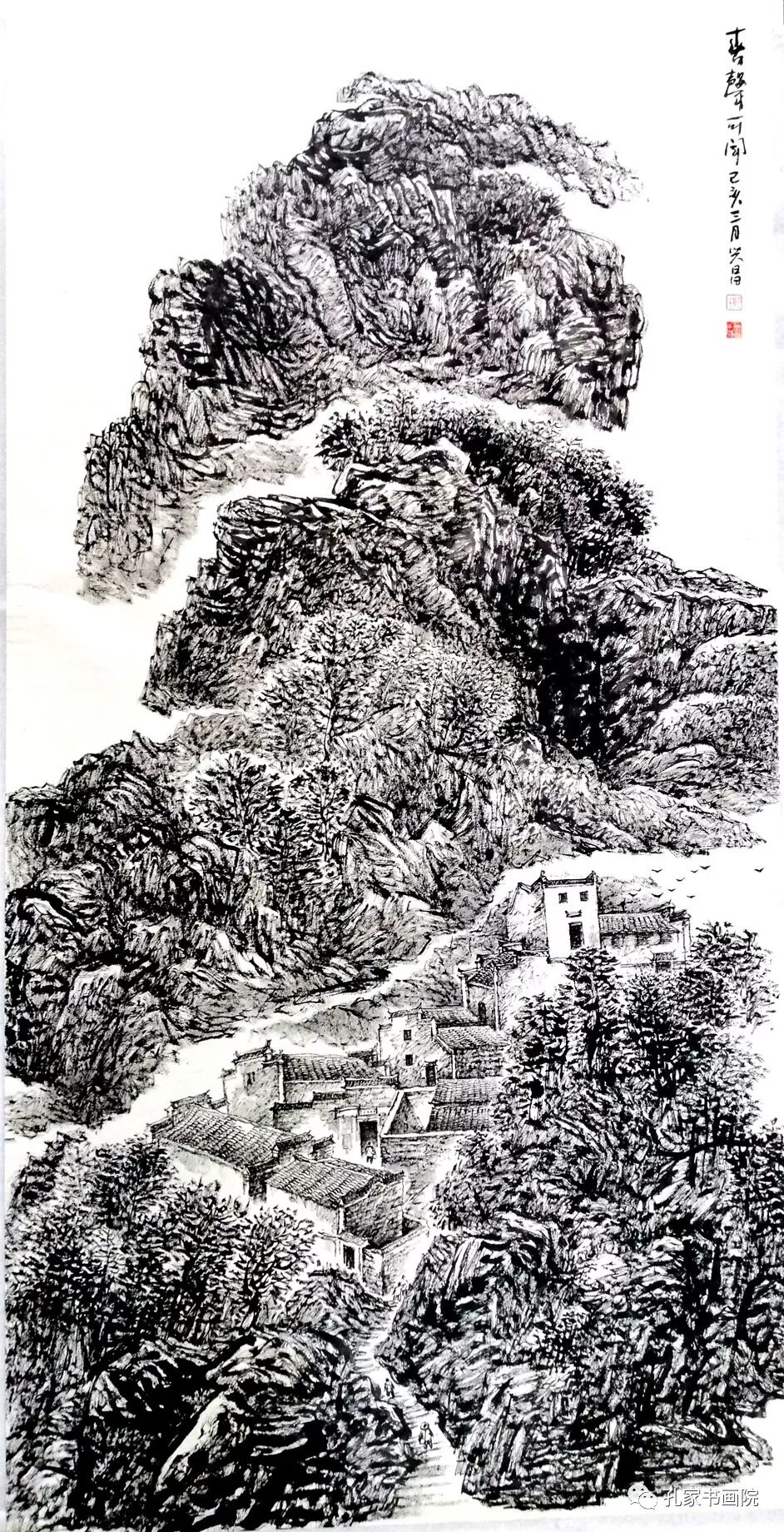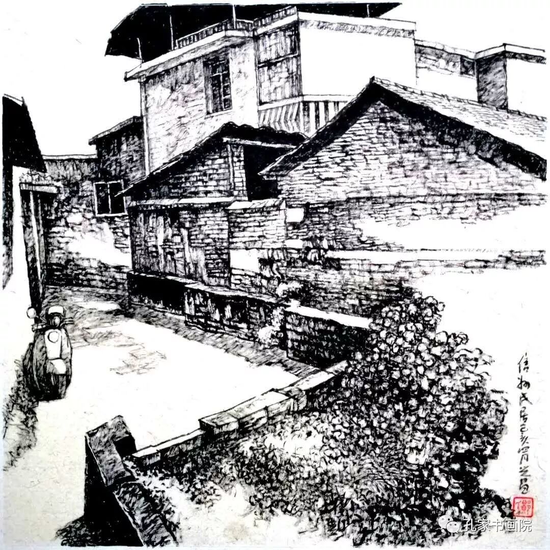 今观郑兴昌焦墨作品及古民居系列颇多感受,其用笔大胆,点线准确。繁简适中,五色相生实属不易。同时也从中反应出斯人在绘画中的天份与修养。中国画是修出来的!中国画是悟出来的!中国画是沧桑人生的内外共呜,非一时性起三天半的毛手毛脚可达。