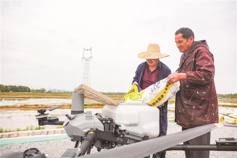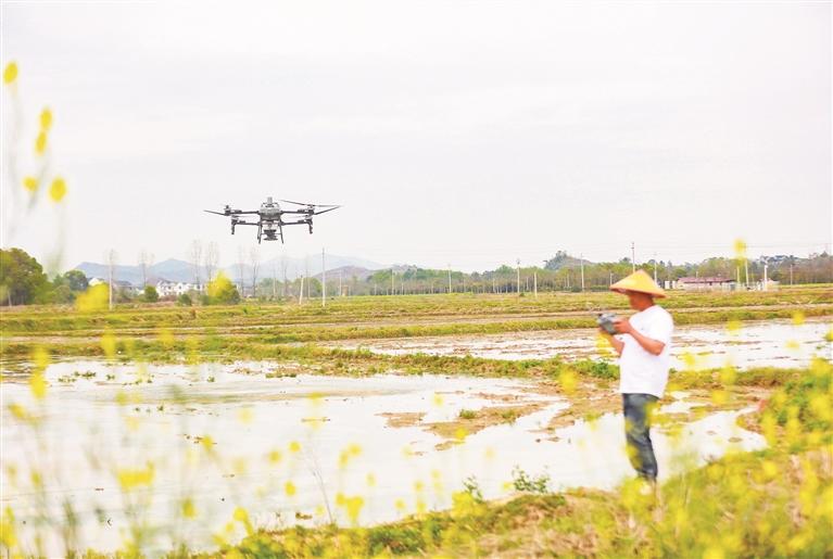 4月9日,在横峰县莲荷乡丁家村农田里,农机手正在利用植保无人机给农田施肥,为下阶段水稻种植打好基础。