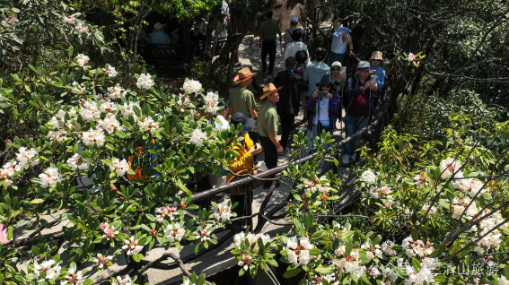 当三清山的晨雾还未散尽,第一缕阳光已穿透薄云,为漫山杜鹃镀上金边。海拔1600米的悬崖栈道上,猴头杜鹃踮着脚尖攀附在岩壁,云锦杜鹃在松影间摇曳生姿,红岩杜鹃则像一团团跳动的火焰点燃了整座仙山的春意。