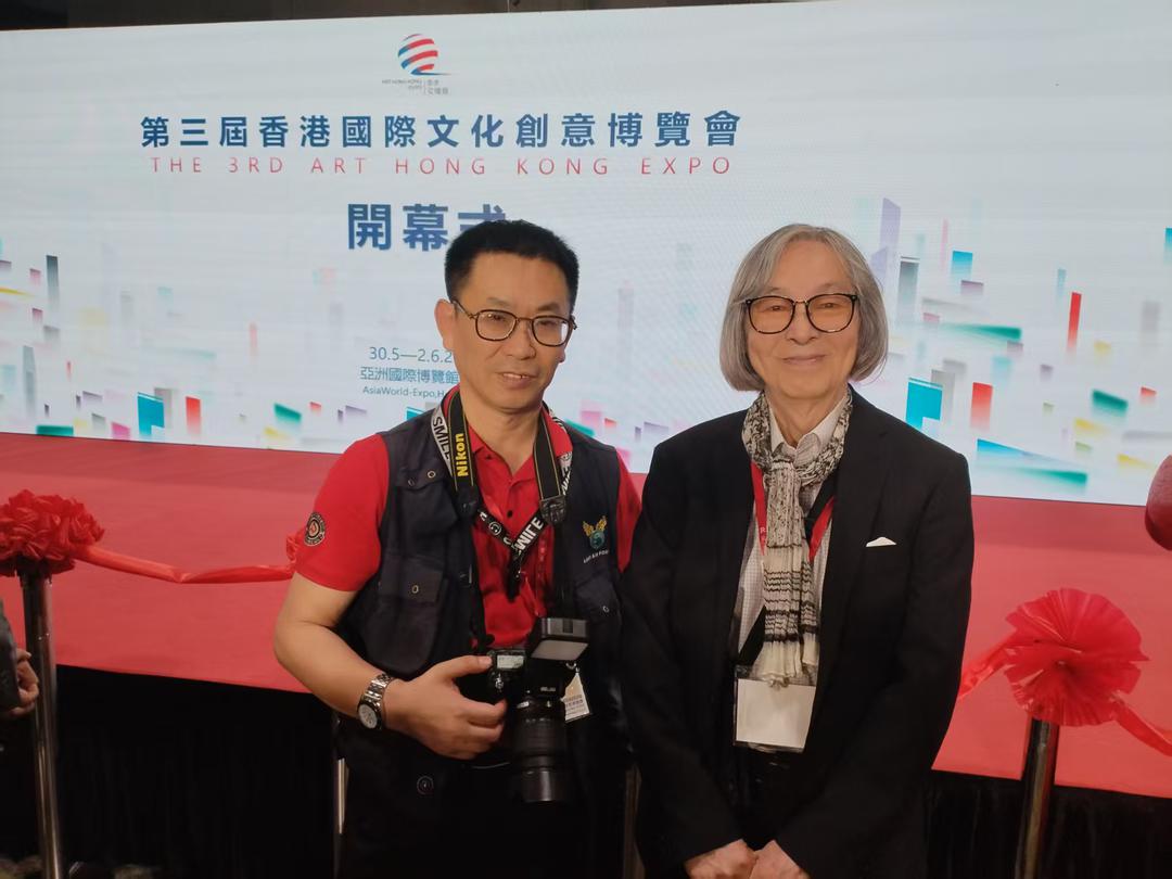 王群在香港文博会现场采访香港特别行政区立法会议员,香港艺术发展局主席霍启刚。共工社发