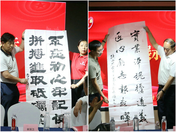 艺术为爱国情怀增添隽永注脚。中书协、中美协会员冯世平老师的篆书作品“不忘初心牢记使命,拼搏进取砥砺前行”,以及杨仕斗老师特为活动创作并赠予优秀企业家彬县煤炭有限公司董事长郑孝儒的“实业淬魂担道义,匠心立志报春晖”,不仅传递着对企业家贡献的崇高敬意与殷切期望,更是“文化铸魂”的生动象征,为爱国精神镌刻下艺术印记。