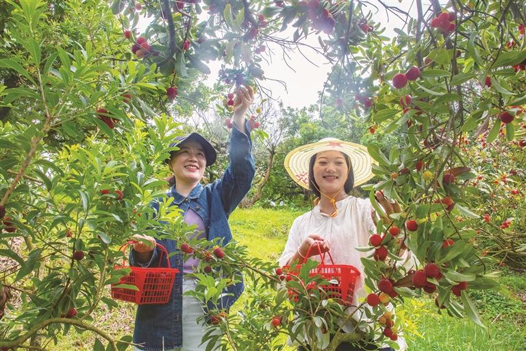 6月6日,横峰县青板乡薛家村红日种养专业合作社的杨梅成熟上市,游客提着篮子穿梭在杨梅树间采摘尝鲜。